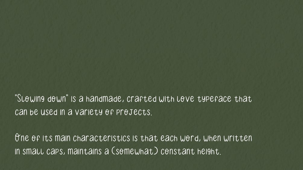 Slowing Down is a handmade, crafted-with-love typeface that can be used in a variety of creative projects. One of it's main characteristics is that each word, when written in small caps, maintains a (somewhat) constant height.
