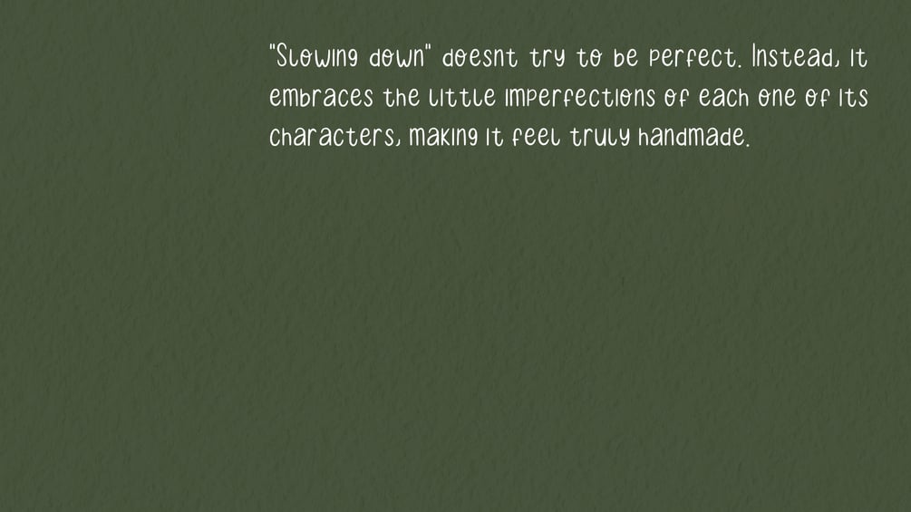 Slowing Down no trata de ser perfecta. En cambio, acoge las pequeñas imperfecciones de cada uno de sus caracteres, haciéndola sentir realmente hecha a mano.